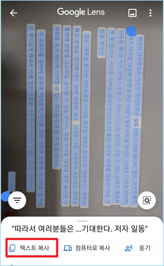 2. 밑에 있는 텍스트에 맞춰두고 책 내용을 구글렌즈로 가까이 가져갑니다.
