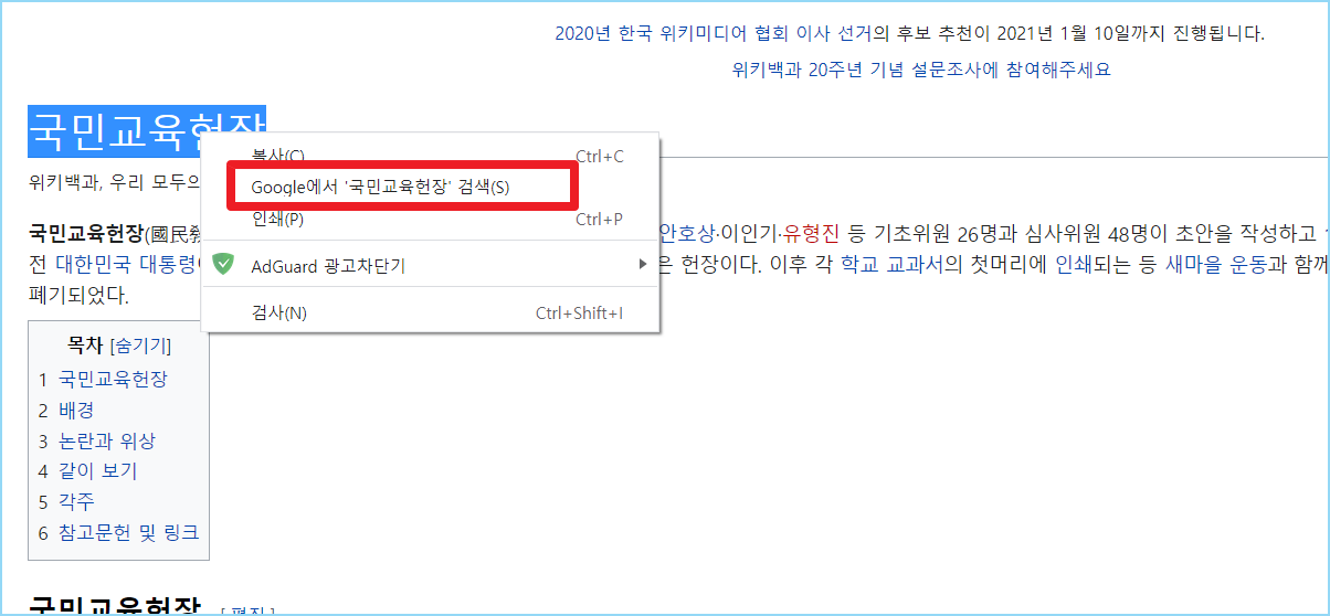검색하고자 하는 부분을 드래그합니다. 그리고 오른쪽 마우스를 누르면 Google에서 '국민교육헌장' 검색(s)를 눌러주면 바로 검색을 해 줍니다.