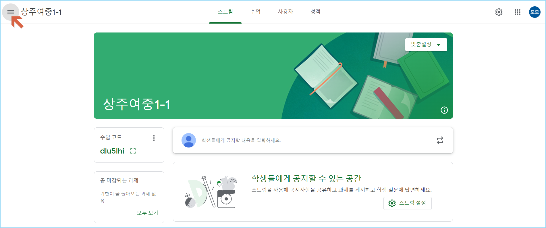 상주여중1-1 교실이 만들어졌습니다. 그럼 상주여중 1-2, ...계속 만들어야 되는데요. 상주여중 1-1옆에 있는 세줄아이콘을 누릅니다.