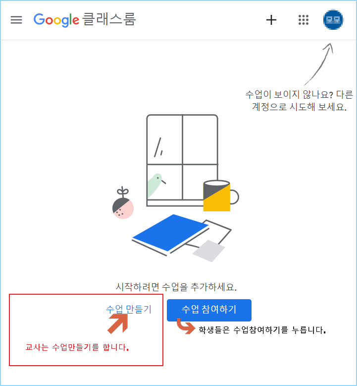 수업만들기와 수업참여하기 두 버튼이 나옵니다. 그 중 교사는 수업만들기를 눌러야 합니다.