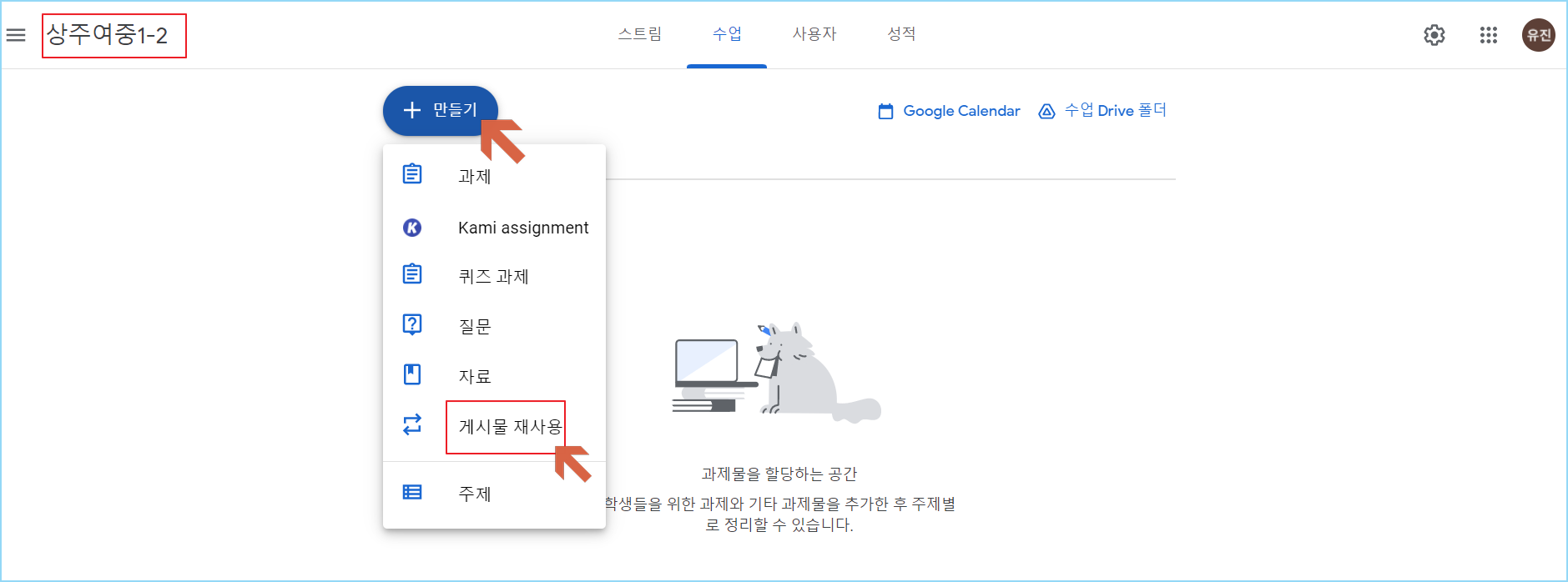 1. 상주여중1-2반으로 갑니다. +만들기를 누릅니다. 게시물 재사용을 누릅니다.