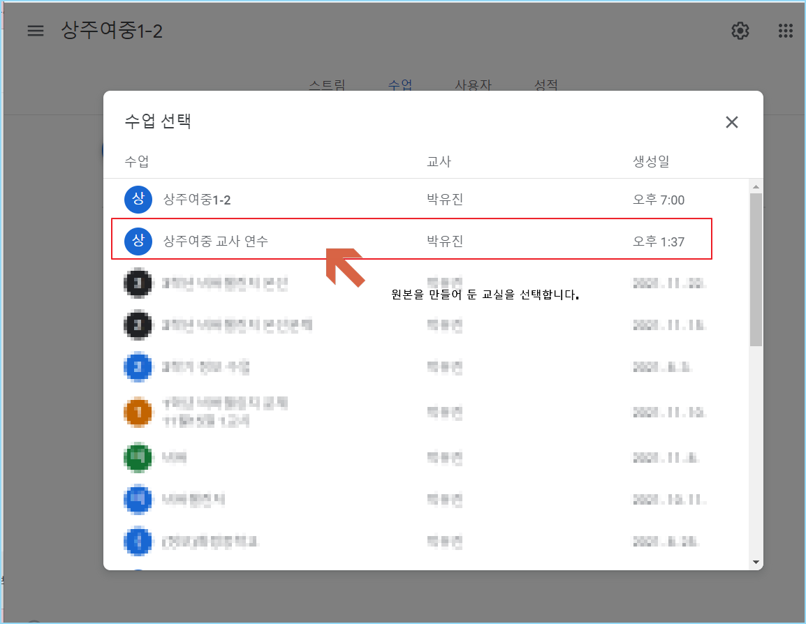 원본을 만들어 둔 교실을 선택합니다. 저는 상주여중 교사 연수방에 만들어 둔 학습자료 3가지를 넣어 보도록 하겠습니다.