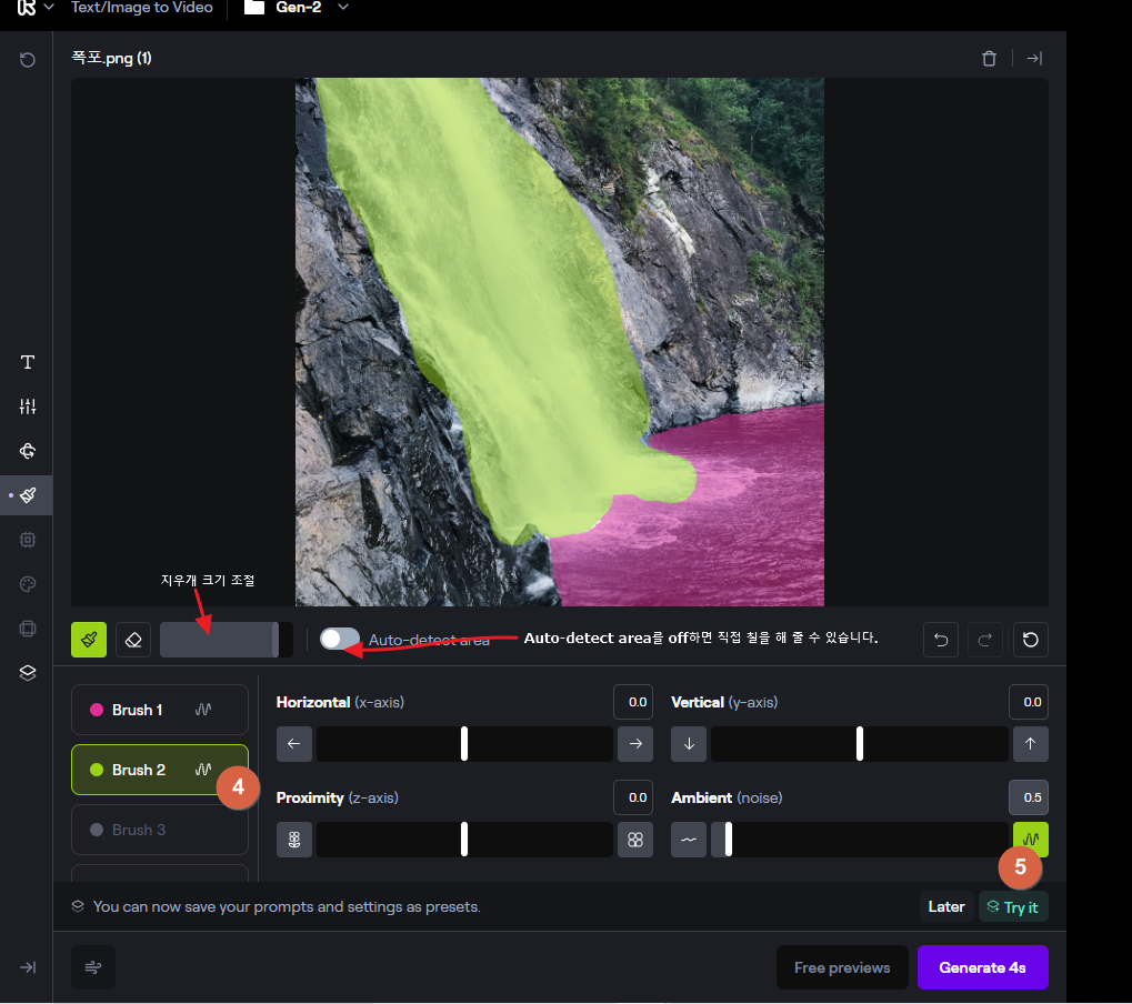 Brush3을 선택하여 칠합니다. 그런다음 Generate 4s를 눌러 실행시킵니다.