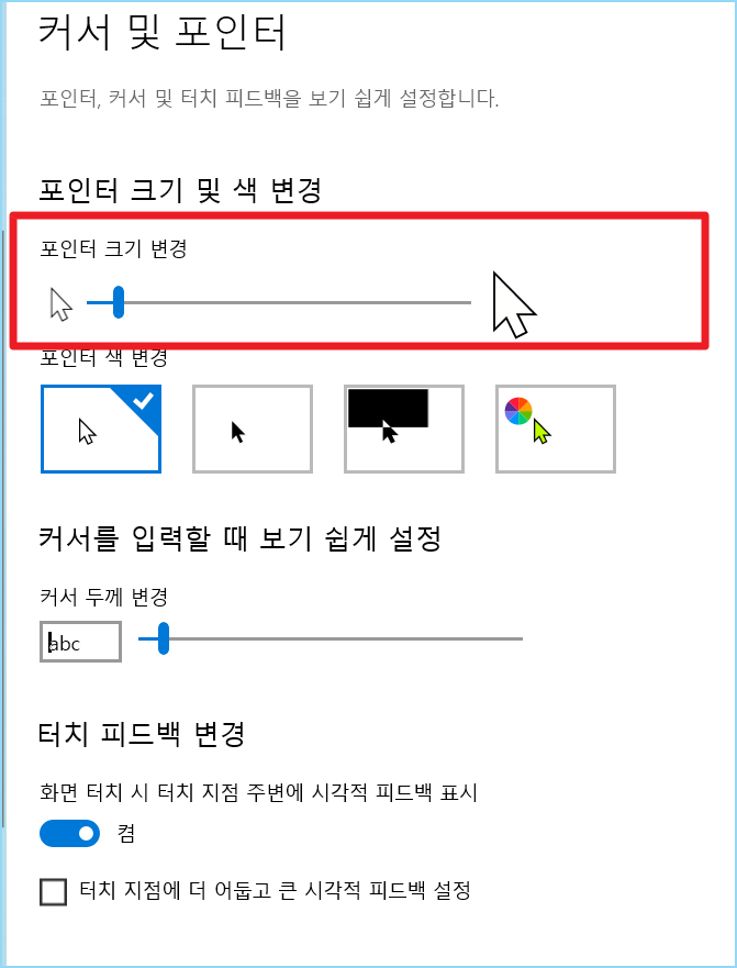 4. 마우스 및 커서 크기 조정을 눌러줍니다.