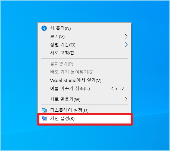 1. 바탕화면에서 오른쪽 마우스를 클릭합니다. (개인 설정으로 들어갑니다.)