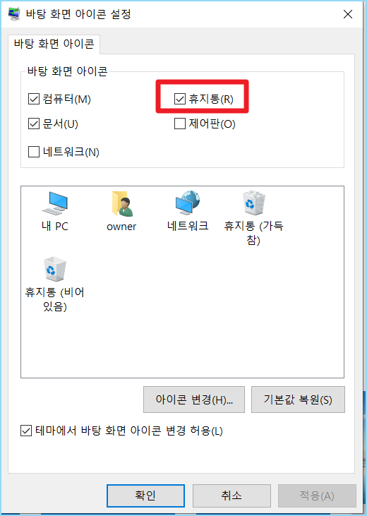 4. 휴지통을 선택하면 바탕 화면에 휴지통이 나타난답니다.