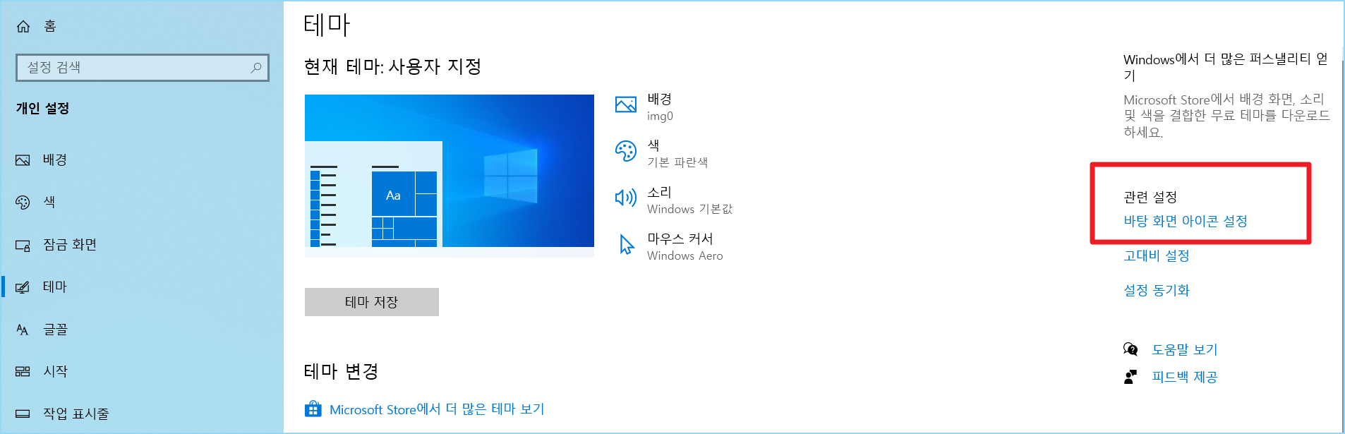 3. 관련 설정에서 바탕화면 아이콘 설정을 눌러줍니다.