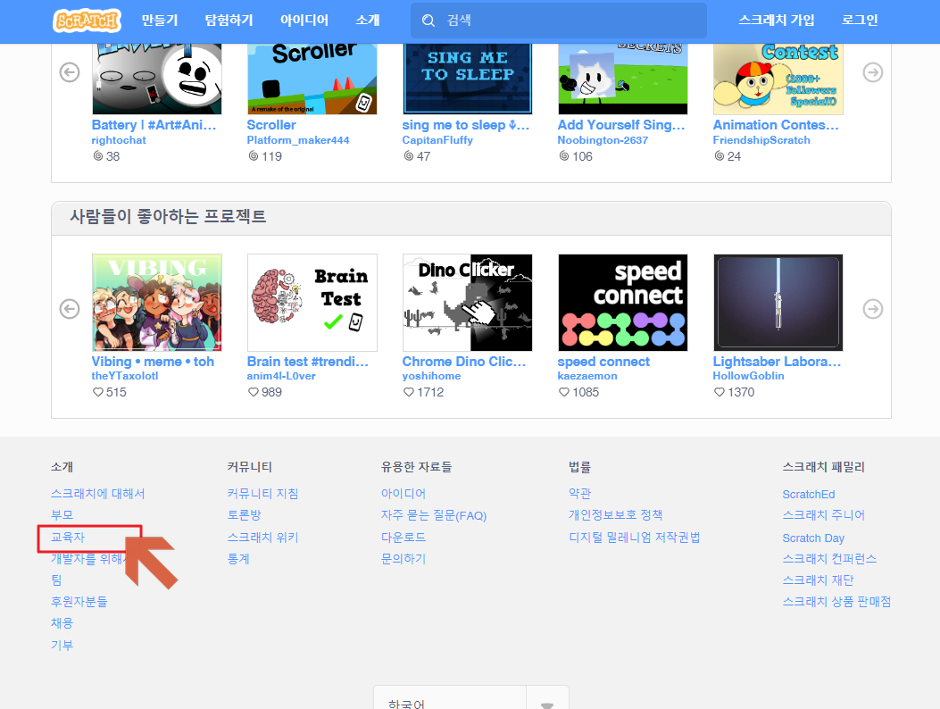 스크래치 홈페이지 맨 아랫단에 있는 교육자를 클릭합니다.