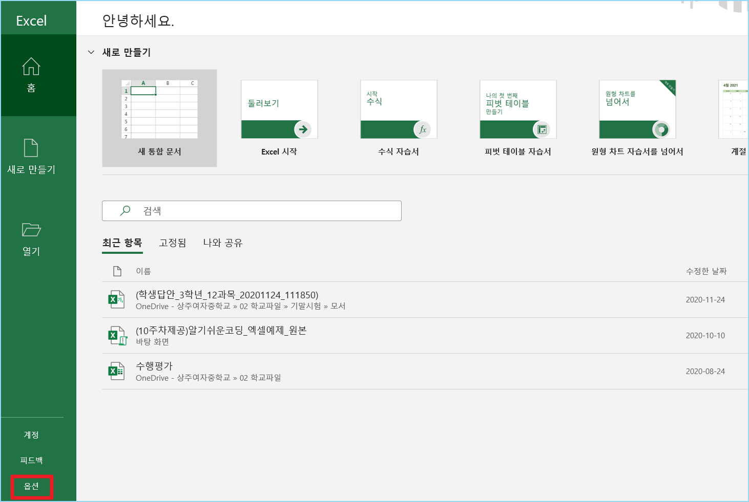 1. 엑셀창을 열면 맨 아래에 옵션이 있습니다. 옵션으로 들어가세요.