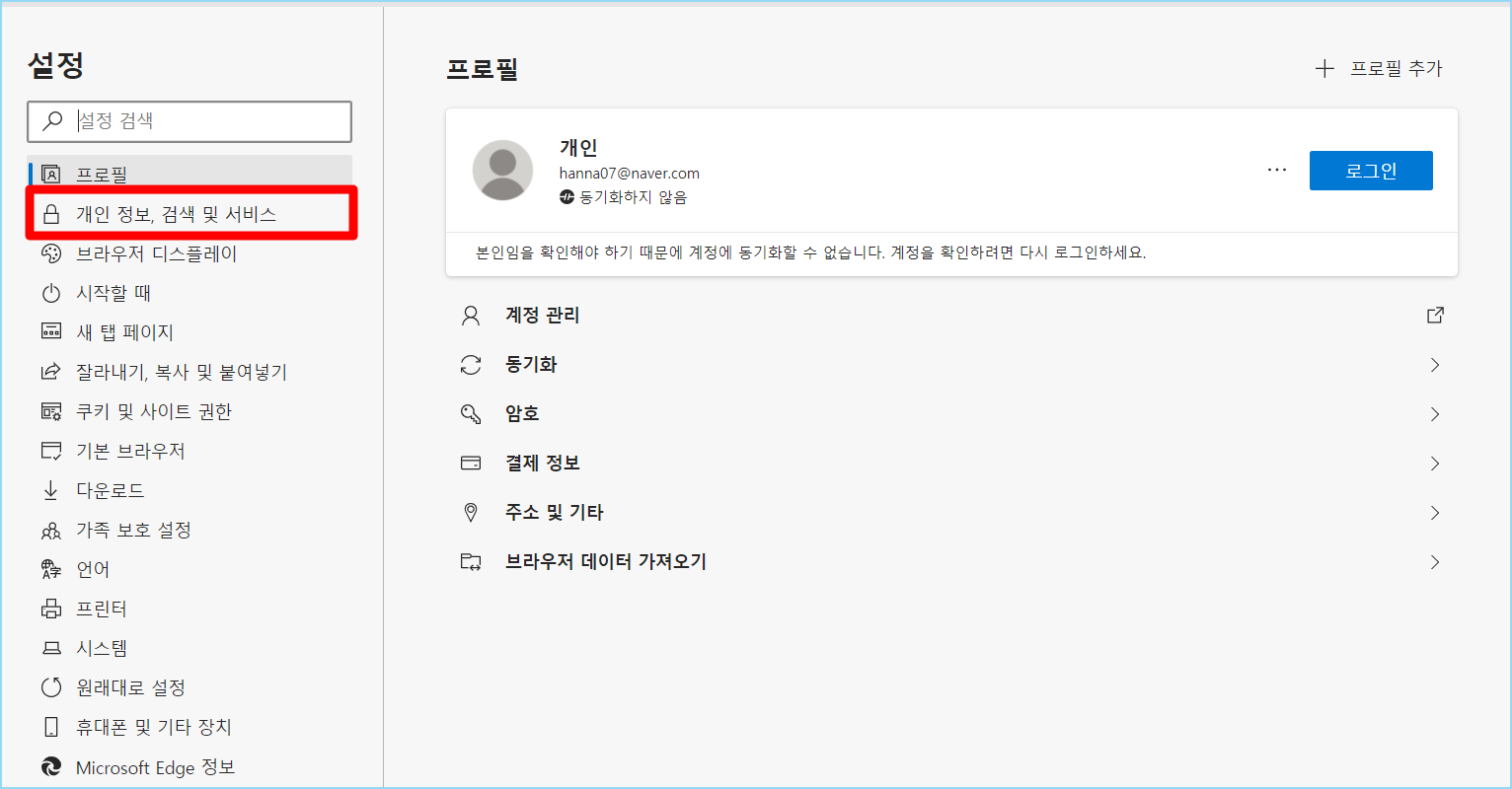 3. 설정으로 들어가면 아래의 화면이 나옵니다. (개인 정보, 검색 및 서비스를 눌러주세요)