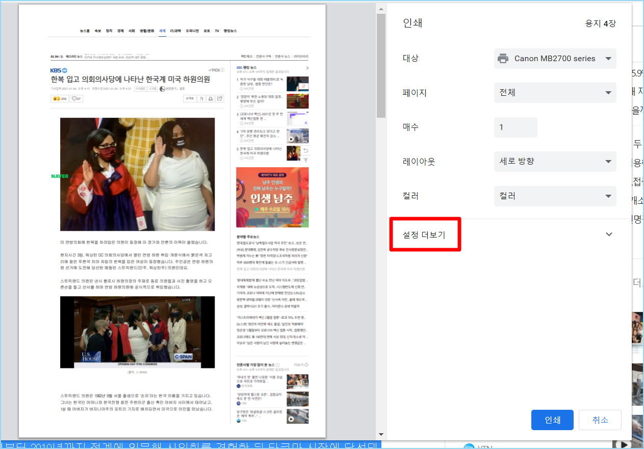 3. 인쇄로 들어간다. 설정 더보기를 누른다.