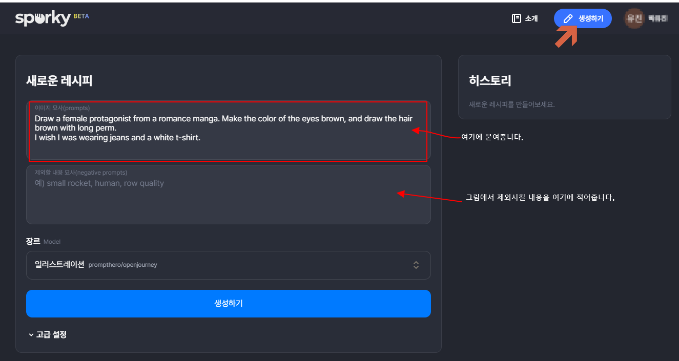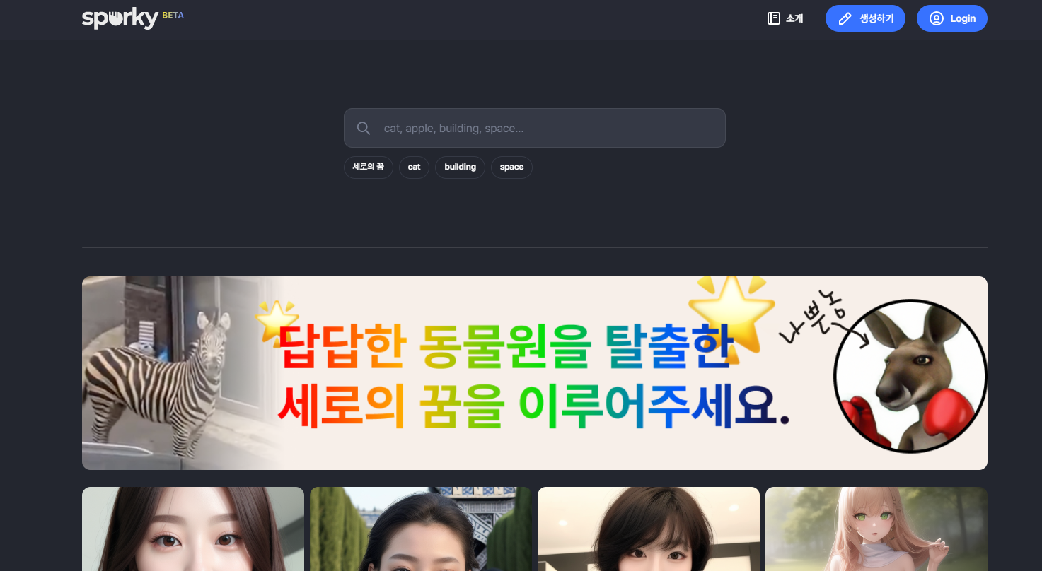 다음으로는 sporky.ai라는 사이트가 있습니다. 우리나라에서 만든 인공지능 그리기 사이트 입니다. 한 번 들어가서 만들어 보겠습니다.