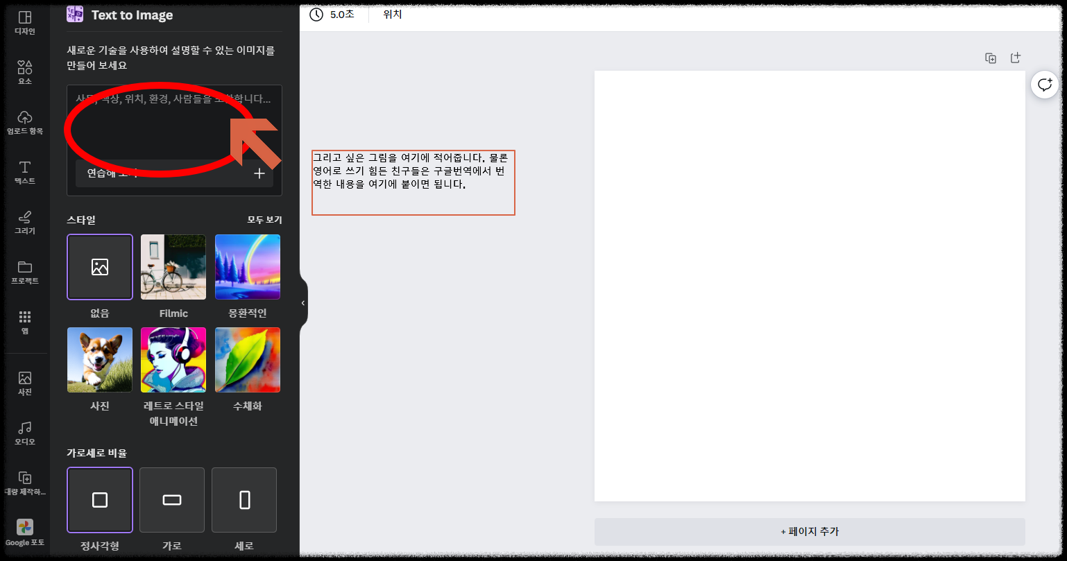 먼저 인공지능은 영어로 학습을 많이했기 때문에, 구글번역이나, 파파고에서 번역을 해서 글을 붙여주면 더 멋진 그림을 그려줍니다.