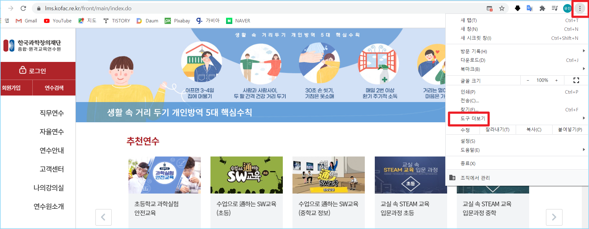 1. 자주 방문하는 사이트에 들어갑니다. (우쪽 점3개를 눌러 도구 더보기로 들어갑니다)