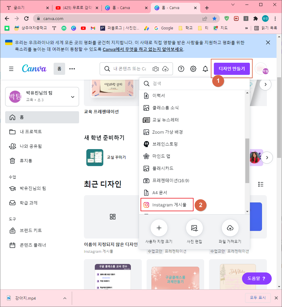 오늘은 칸바를 이용하여 동영상 파일을 만들어 보았습니다. 여러분들이 찍은 영상도 칸바에서 편집하여 예쁘게 만들어 올릴 수 있답니다.