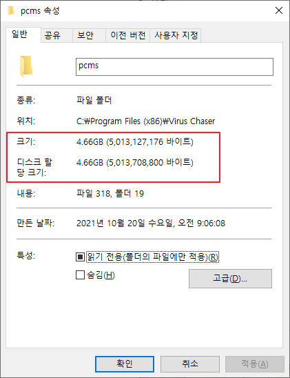 c: \Program Files(x86)\virus chaser\pcms 속성에서 크기가 4.66GB정도 되어야 됩니다. 10분 정도 계속 프로그램이 깔리는 경우에는 그대로 두시고 10분 후에 확인해 보세요.