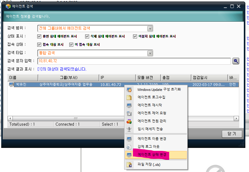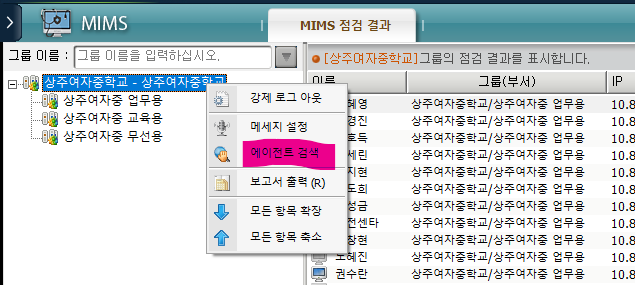 그래도 선생님 컴퓨터에 pc지키미가 뜨지 않으면 sjasc console로 가서 에이전트검색에서 컴퓨터 ip주소를 찾습니다. 비실행으로 되어 있는 것을 실행으로 바꾸어 주어야 합니다.