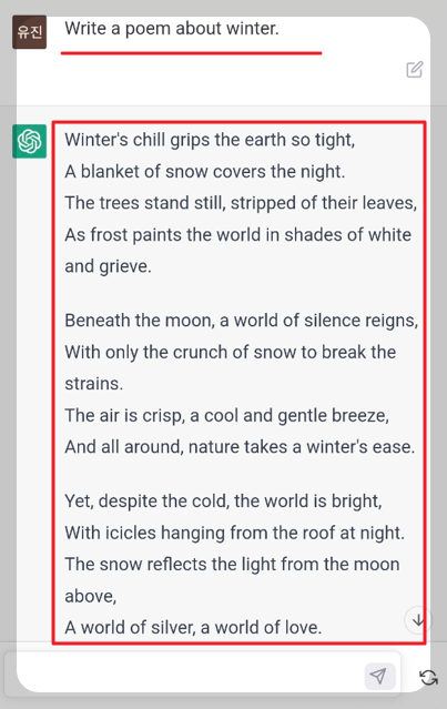 3). 결과 겨울에 관련된 시를 인공지능이 적어주었습니다.