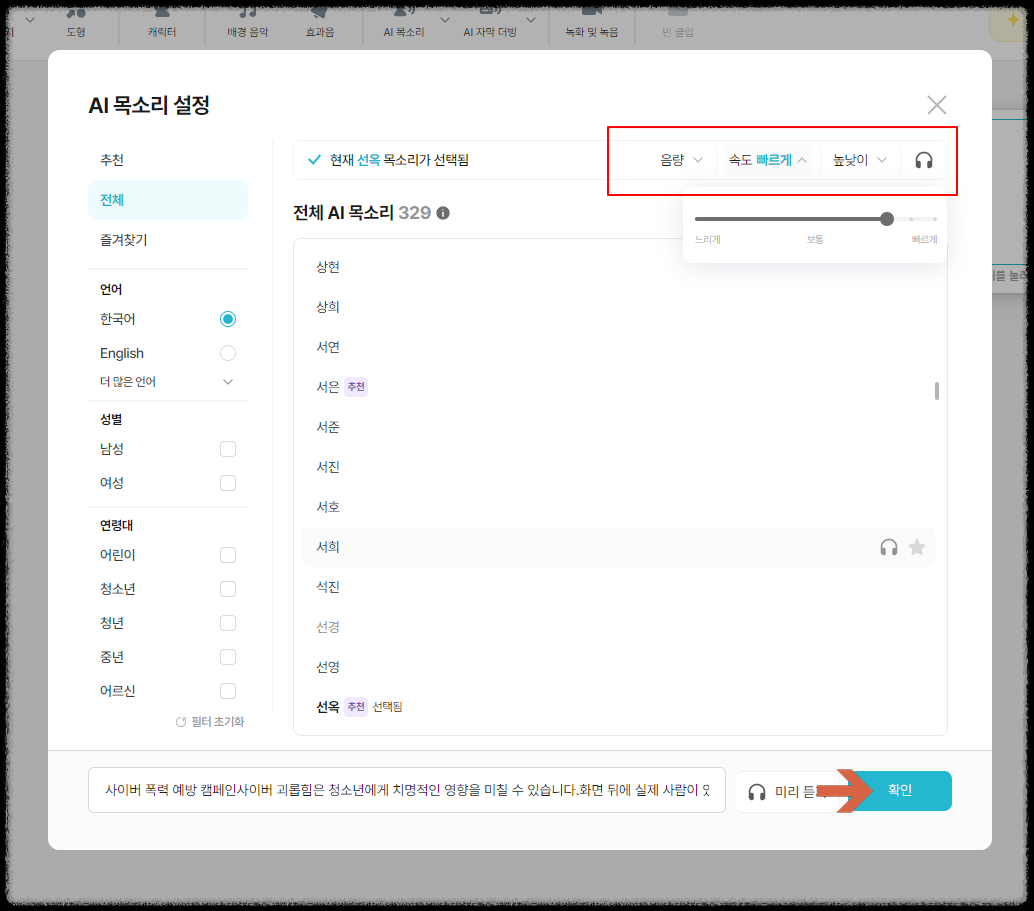 그런 다음 음량, 속도, 높낮이를 미리듣기로 들어보면서 선택한 후 확인을 눌러주세요.